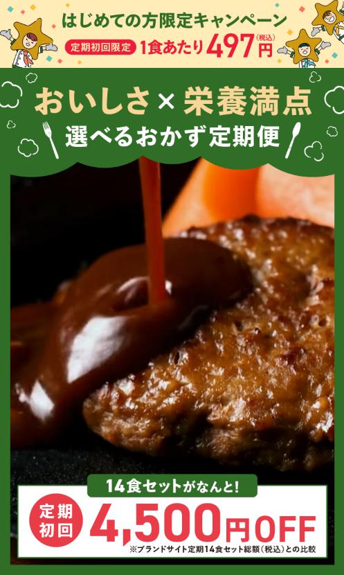 ただいま、一流シェフの味の料理を「定期初回1食497円(税込)」で注文できる初回限定キャンペーン(※定期初回キャンペーン価格)が実施されています。