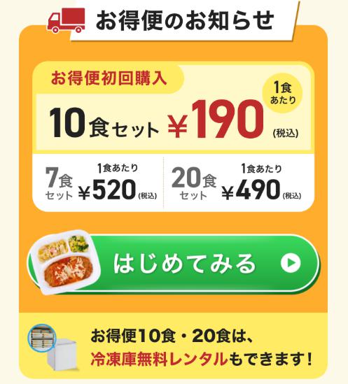 | 初回特典 | 10食セット 初回約63%OFF 冷凍庫無料レンタル |