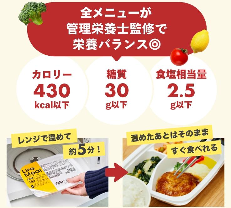 ライフミールは、すべてのメニューが管理栄養士の監修のもと、糖質30g以下・食塩相当量2.5g以下という独自の栄養基準で設計されています。
