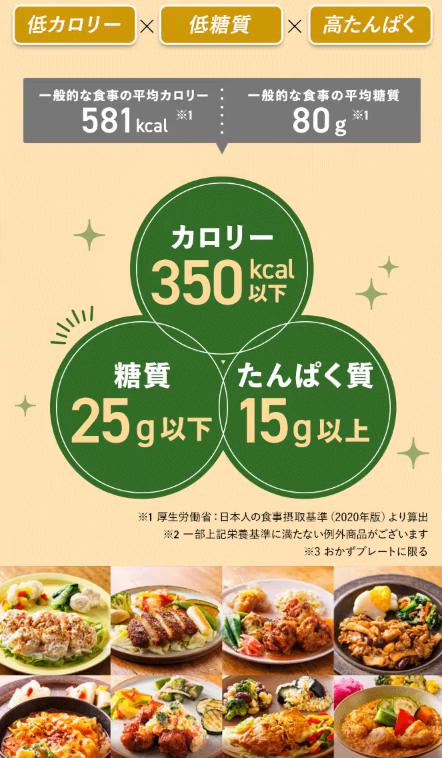 ![]() 350kcal以下※1 糖質25g以下※1 たんぱく質15g以上※1 | ![]() 全メニュー 430kcal以下 糖質30g以下 塩分2.5g以下 | ![]() 管理栄養士が監修 | ![]() ビタミン&ミネラル26種 たんぱく質約13.5g※5 糖質約30%OFF※6 |
