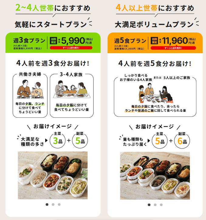 ※1 3食プランを4人家族で召し上がる場合、5,990円÷4人÷3食=499円 ※2 遷移先ページに記載のクーポンコード入力の場合のみ適用。 ※3 初回申し込みの方限定。